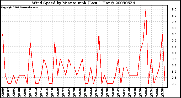 Milwaukee Weather -- 20080624 Wind Speed by Minute mph (Last 1 Hour) -- From curtronics.com by Curt Blank