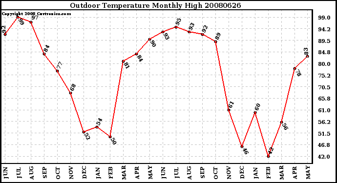 Milwaukee Weather -- 20080626 Outdoor Temperature Monthly High -- From curtronics.com by Curt Blank
