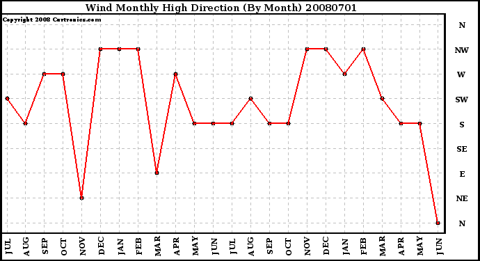 Milwaukee Weather -- 20080701 Wind Monthly High Direction (By Month) -- From curtronics.com by Curt Blank