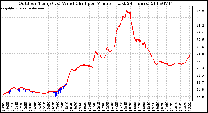 Milwaukee Weather -- 20080711 Outdoor Temp (vs) Wind Chill per Minute (Last 24 Hours) -- From curtronics.com by Curt Blank