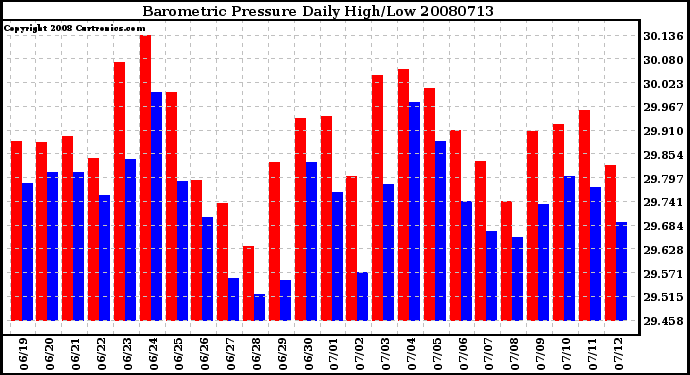Milwaukee Weather -- 20080713 Barometric Pressure Daily High/Low -- From curtronics.com by Curt Blank