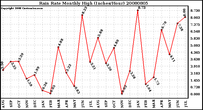 20080805 Rain Rate Monthly High (Inches/Hour)
