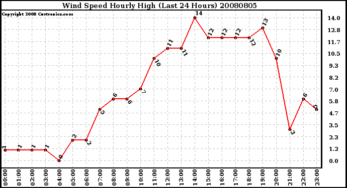 20080805 Wind Speed Hourly High (Last 24 Hours)