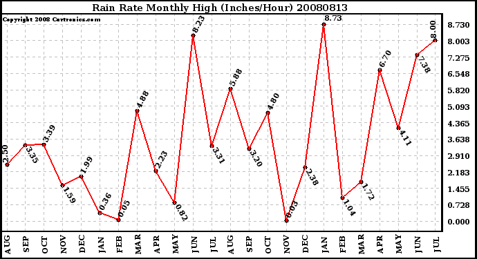 Milwaukee Weather -- 20080813 Rain Rate Monthly High (Inches/Hour) -- From curtronics.com by Curt Blank