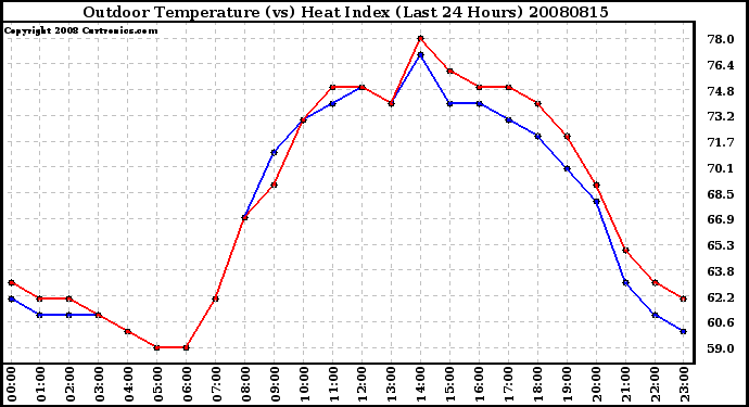 Milwaukee Weather -- 20080815 Outdoor Temperature (vs) Heat Index (Last 24 Hours) -- From curtronics.com by Curt Blank