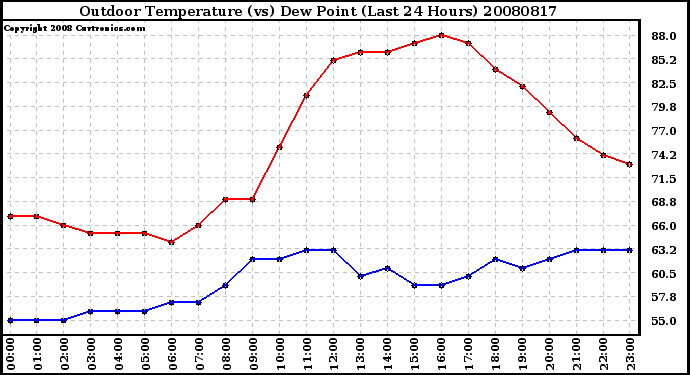 Milwaukee Weather -- 20080817 Outdoor Temperature (vs) Dew Point (Last 24 Hours) -- From curtronics.com by Curt Blank