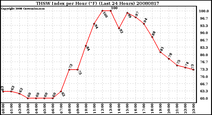 Milwaukee Weather -- 20080817 THSW Index per Hour (°F) (Last 24 Hours) -- From curtronics.com by Curt Blank