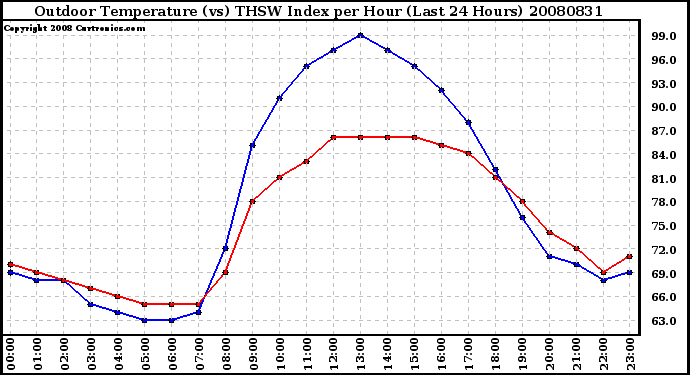 Milwaukee Weather -- 20080831 Outdoor Temperature (vs) THSW Index per Hour (Last 24 Hours) -- From curtronics.com by Curt Blank