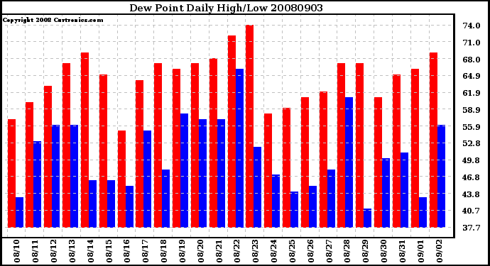 Milwaukee Weather -- 20080903 Dew Point Daily High/Low -- From curtronics.com by Curt Blank