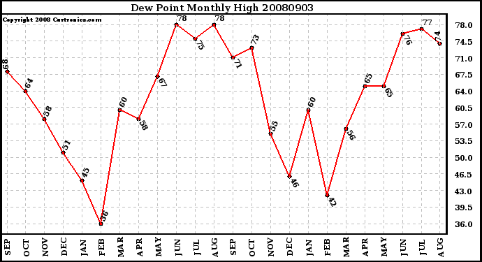 Milwaukee Weather -- 20080903 Dew Point Monthly High -- From curtronics.com by Curt Blank