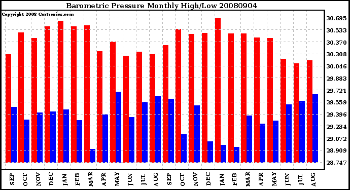 Milwaukee Weather -- 20080904 Barometric Pressure Monthly High/Low -- From curtronics.com by Curt Blank