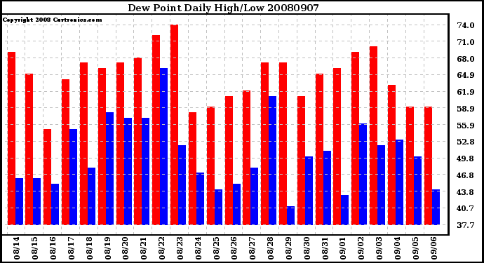 Milwaukee Weather -- 20080907 Dew Point Daily High/Low -- From curtronics.com by Curt Blank