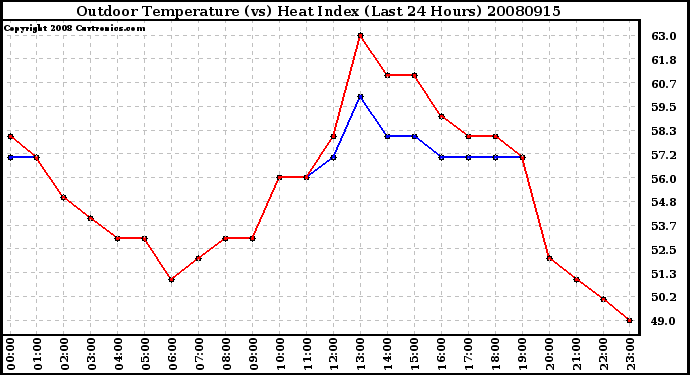 Milwaukee Weather -- 20080915 Outdoor Temperature (vs) Heat Index (Last 24 Hours) -- From curtronics.com by Curt Blank
