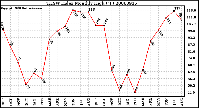 Milwaukee Weather -- 20080915 THSW Index Monthly High (°F) -- From curtronics.com by Curt Blank