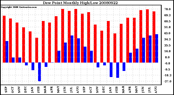 Milwaukee Weather -- 20080922 Dew Point Monthly High/Low -- From curtronics.com by Curt Blank
