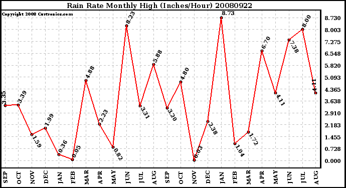 Milwaukee Weather -- 20080922 Rain Rate Monthly High (Inches/Hour) -- From curtronics.com by Curt Blank