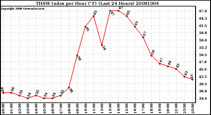 Milwaukee Weather -- 20081004 THSW Index per Hour (°F) (Last 24 Hours) -- From curtronics.com by Curt Blank
