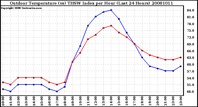 Milwaukee Weather -- 20081011 Outdoor Temperature (vs) THSW Index per Hour (Last 24 Hours) -- From curtronics.com by Curt Blank
