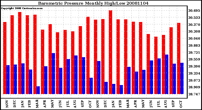 Milwaukee Weather -- 20081104 Barometric Pressure Monthly High/Low -- From curtronics.com by Curt Blank