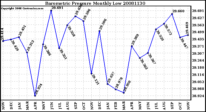 Milwaukee Weather -- 20081130 Barometric Pressure Monthly Low -- From curtronics.com by Curt Blank