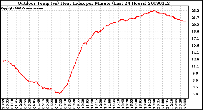 20090112 Outdoor Temp (vs) Heat Index per Minute (Last 24 Hours)
