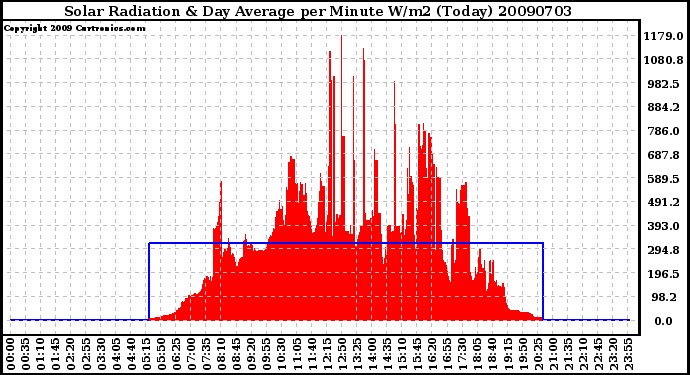 Milwaukee Weather -- 20090703 Solar Radiation & Day Average per Minute W/m2 (Today) -- From curtronics.com by Curt Blank