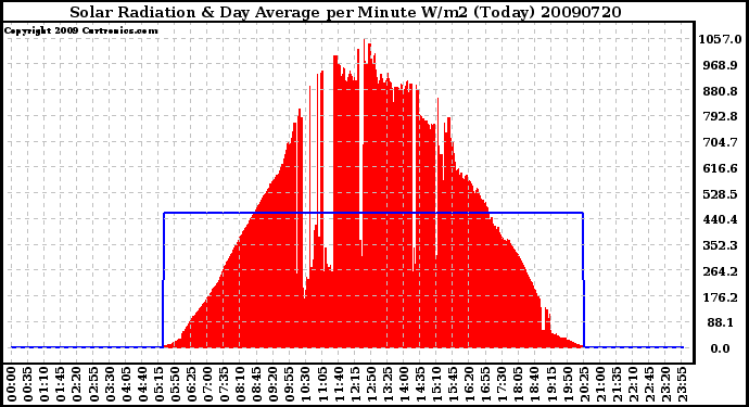 Milwaukee Weather -- 20090720 Solar Radiation & Day Average per Minute W/m2 (Today) -- From curtronics.com by Curt Blank