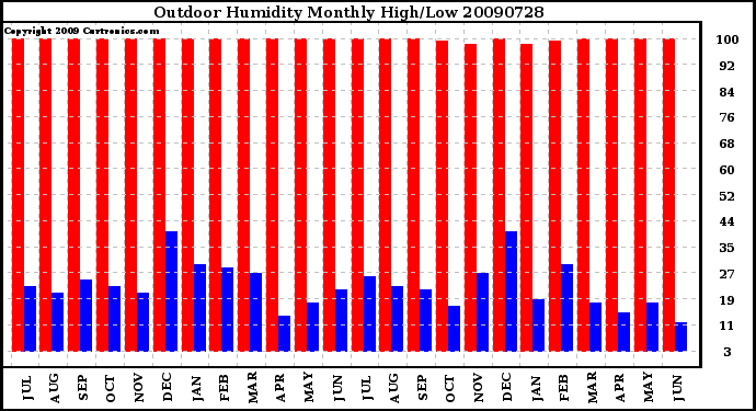 Milwaukee Weather -- 20090728 Outdoor Humidity Monthly High/Low -- From curtronics.com by Curt Blank