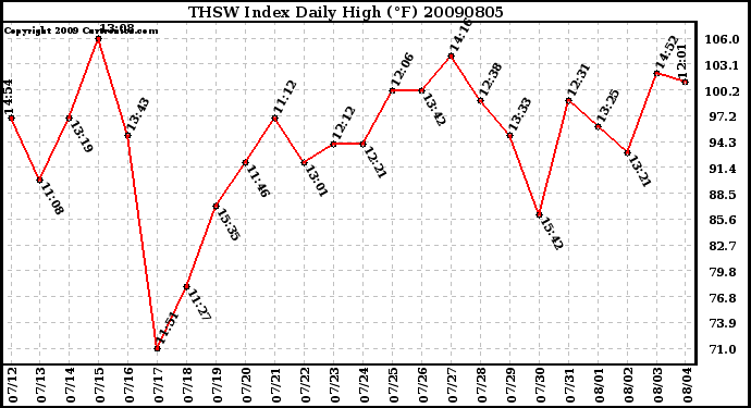 Milwaukee Weather -- 20090805 THSW Index Daily High (°F) -- From curtronics.com by Curt Blank