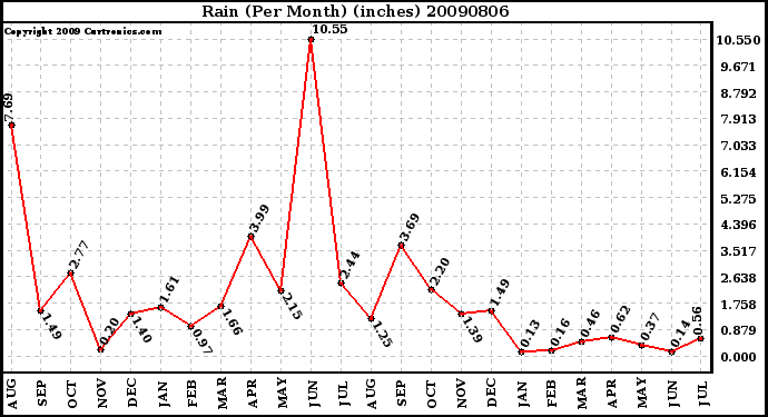Milwaukee Weather -- 20090806 Rain (Per Month) (inches) -- From curtronics.com by Curt Blank