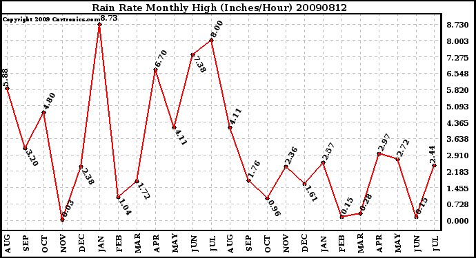 Milwaukee Weather -- 20090812 Rain Rate Monthly High (Inches/Hour) -- From curtronics.com by Curt Blank