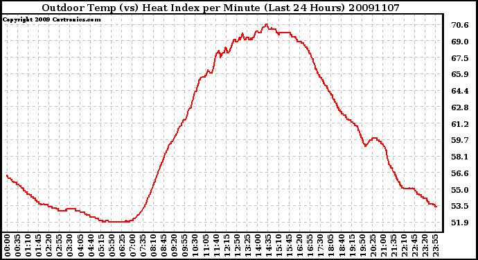 Milwaukee Weather -- 20091107 Outdoor Temp (vs) Heat Index per Minute (Last 24 Hours) -- From curtronics.com by Curt Blank