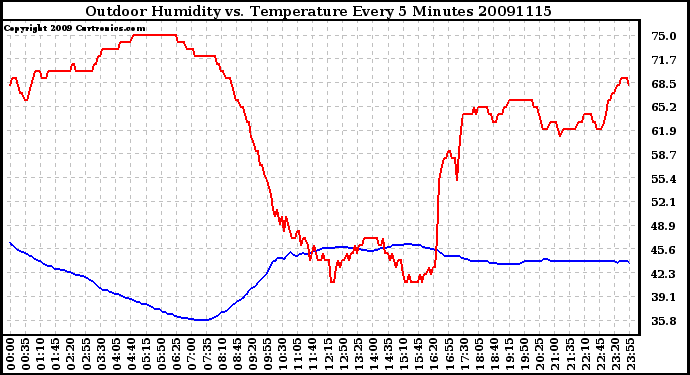 Milwaukee Weather -- 20091115 Outdoor Humidity vs. Temperature Every 5 Minutes -- From curtronics.com by Curt Blank