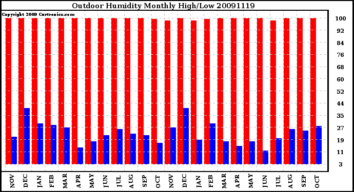Milwaukee Weather -- 20091119 Outdoor Humidity Monthly High/Low -- From curtronics.com by Curt Blank