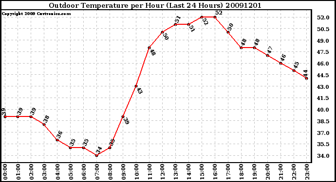 Milwaukee Weather -- 20091201 Outdoor Temperature per Hour (Last 24 Hours) -- From curtronics.com by Curt Blank