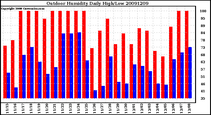 Milwaukee Weather -- 20091209 Outdoor Humidity Daily High/Low -- From curtronics.com by Curt Blank