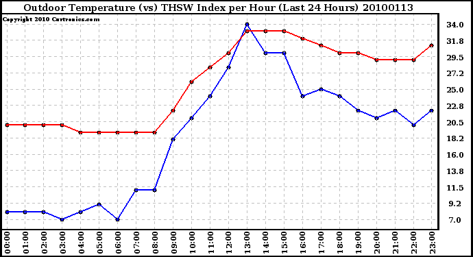 Milwaukee Weather -- 20100113 Outdoor Temperature (vs) THSW Index per Hour (Last 24 Hours) -- From curtronics.com by Curt Blank