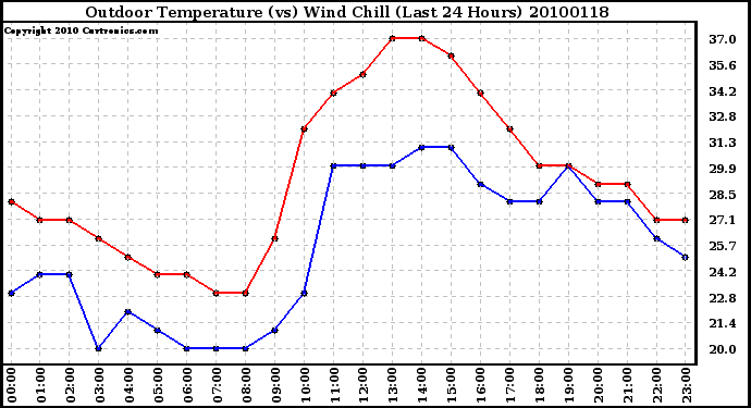 Milwaukee Weather -- 20100118 Outdoor Temperature (vs) Wind Chill (Last 24 Hours) -- From curtronics.com by Curt Blank