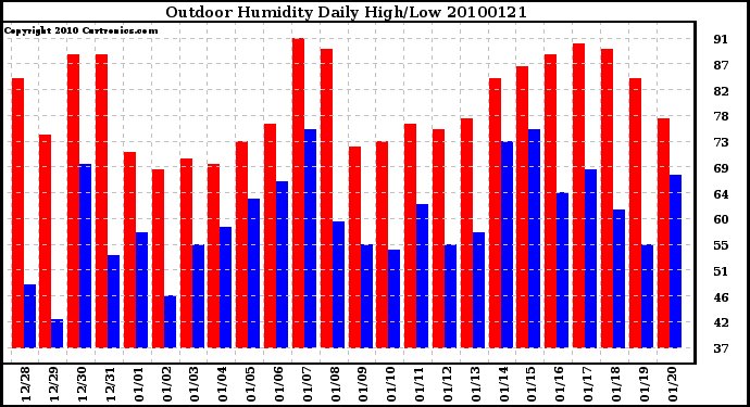 Milwaukee Weather -- 20100121 Outdoor Humidity Daily High/Low -- From curtronics.com by Curt Blank