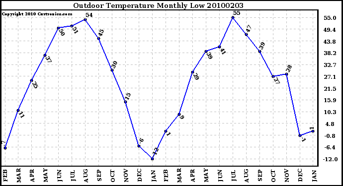 Milwaukee Weather -- 20100203 Outdoor Temperature Monthly Low -- From curtronics.com by Curt Blank