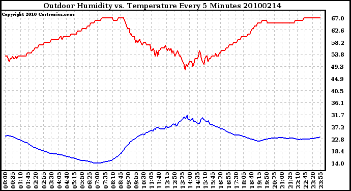 Milwaukee Weather -- 20100214 Outdoor Humidity vs. Temperature Every 5 Minutes -- From curtronics.com by Curt Blank