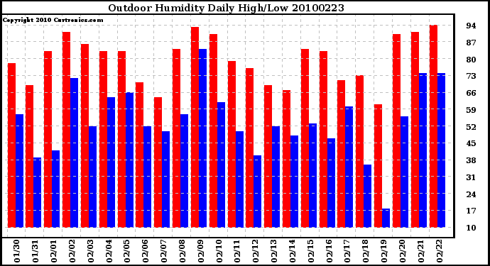 Milwaukee Weather -- 20100223 Outdoor Humidity Daily High/Low -- From curtronics.com by Curt Blank