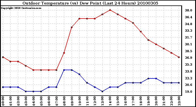 Milwaukee Weather -- 20100305 Outdoor Temperature (vs) Dew Point (Last 24 Hours) -- From curtronics.com by Curt Blank