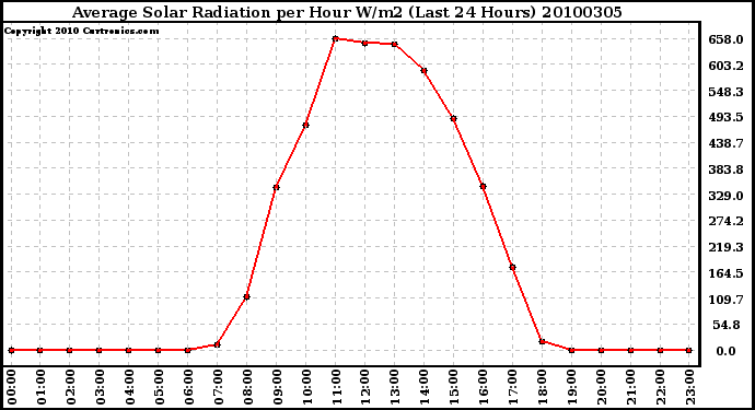 Milwaukee Weather -- 20100305 Average Solar Radiation per Hour W/m2 (Last 24 Hours) -- From curtronics.com by Curt Blank