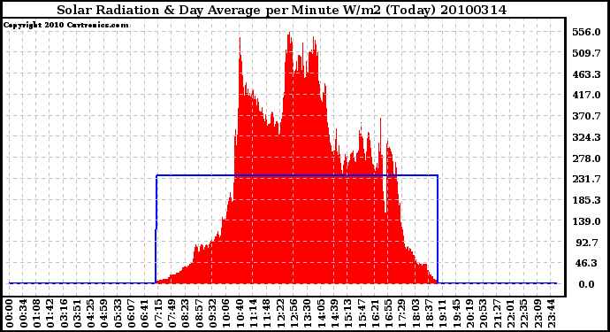 Milwaukee Weather -- 20100314 Solar Radiation & Day Average per Minute W/m2 (Today) -- From curtronics.com by Curt Blank