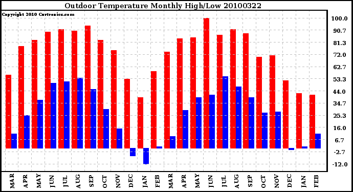 Milwaukee Weather -- 20100322 Outdoor Temperature Monthly High/Low -- From curtronics.com by Curt Blank