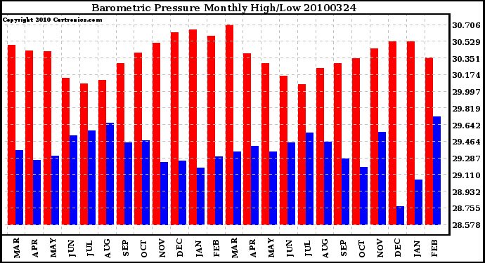 Milwaukee Weather -- 20100324 Barometric Pressure Monthly High/Low -- From curtronics.com by Curt Blank