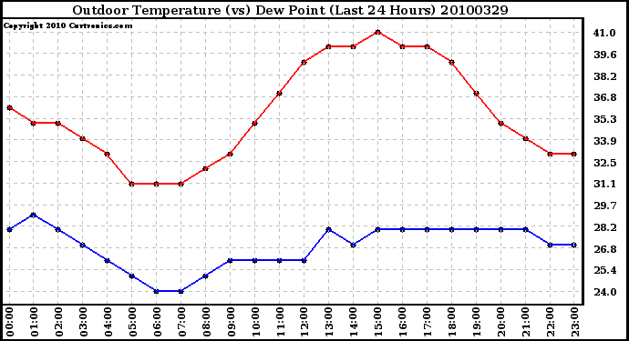 Milwaukee Weather -- 20100329 Outdoor Temperature (vs) Dew Point (Last 24 Hours) -- From curtronics.com by Curt Blank