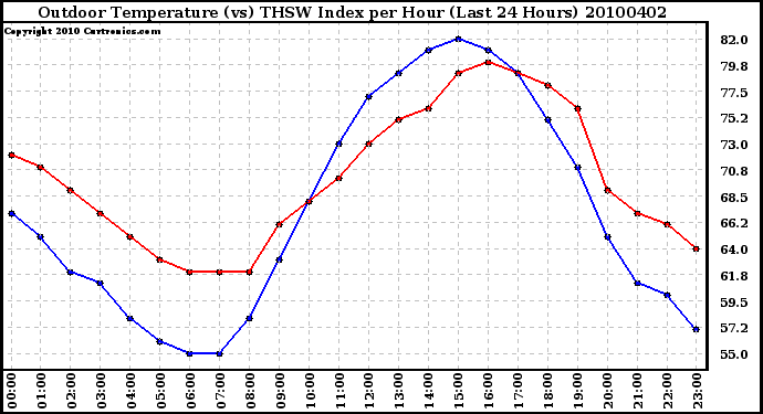 Milwaukee Weather -- 20100402 Outdoor Temperature (vs) THSW Index per Hour (Last 24 Hours) -- From curtronics.com by Curt Blank