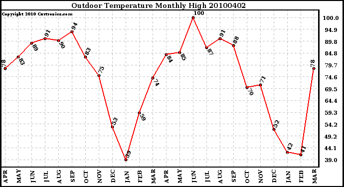 Milwaukee Weather -- 20100402 Outdoor Temperature Monthly High -- From curtronics.com by Curt Blank